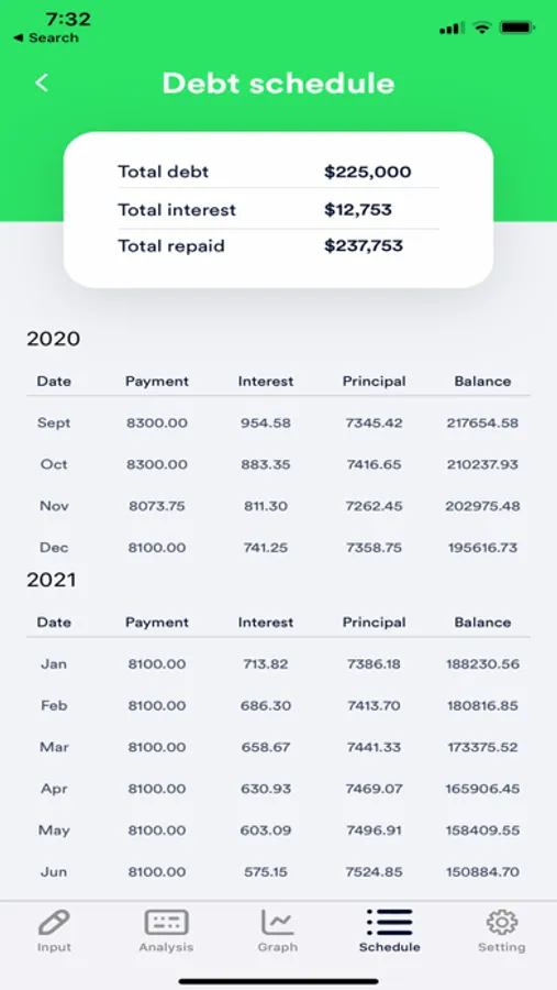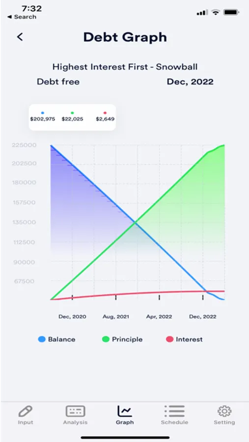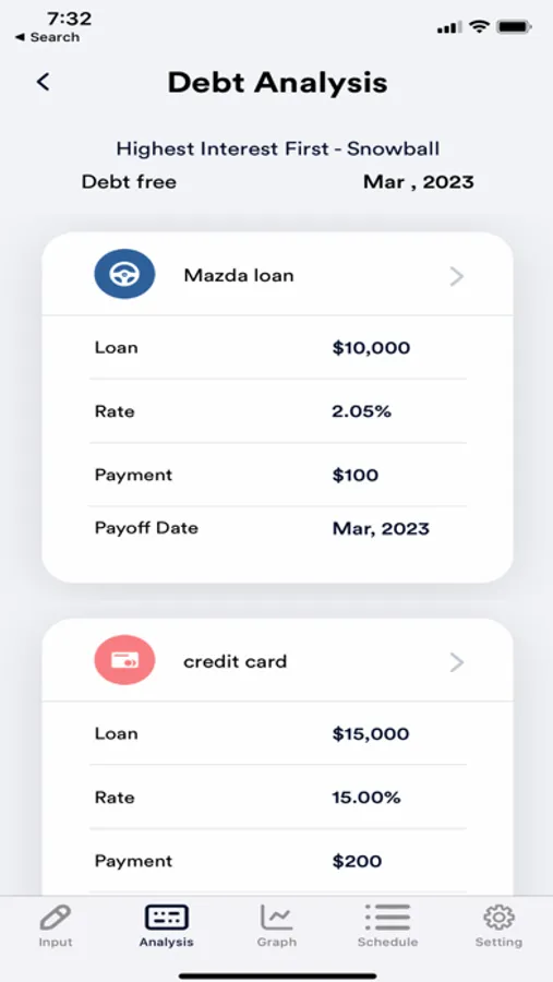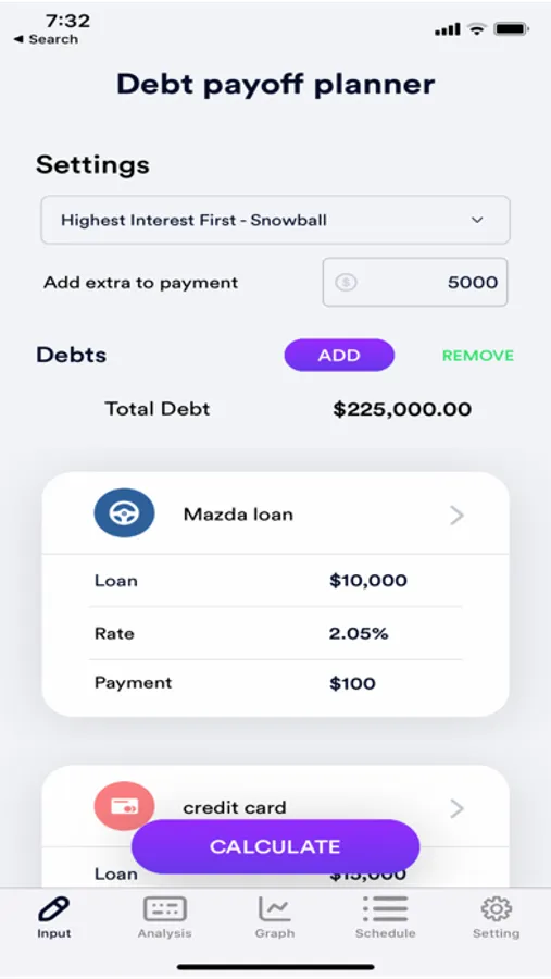 Debt Free Calculator is an easy to use debt & loan calculator. The app lets you enter in various debts that you have and calculates the optimal payment strategy to get you out of debt as soon as possible.