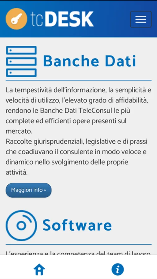 Con TcDesk Mobile sarà possibile consultare, in qualsiasi momento e senza alcuna limitazione, le banche dati e i software TeleConsul, accedere a tutti i servizi, consultare la propria area riservata, aderire agi aventi formativi e verificare i crediti maturati ai fini della formazione continua obbligatoria.