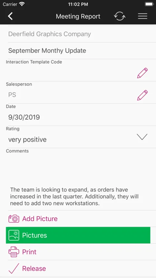 - Mobile sales: create quotes and orders, access customer information and current stock levels, and write additional information and commentary in meeting reports.