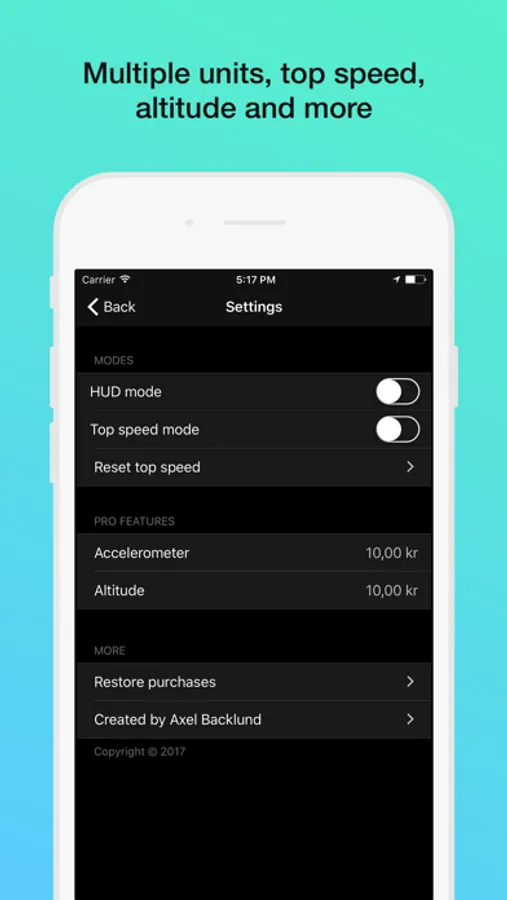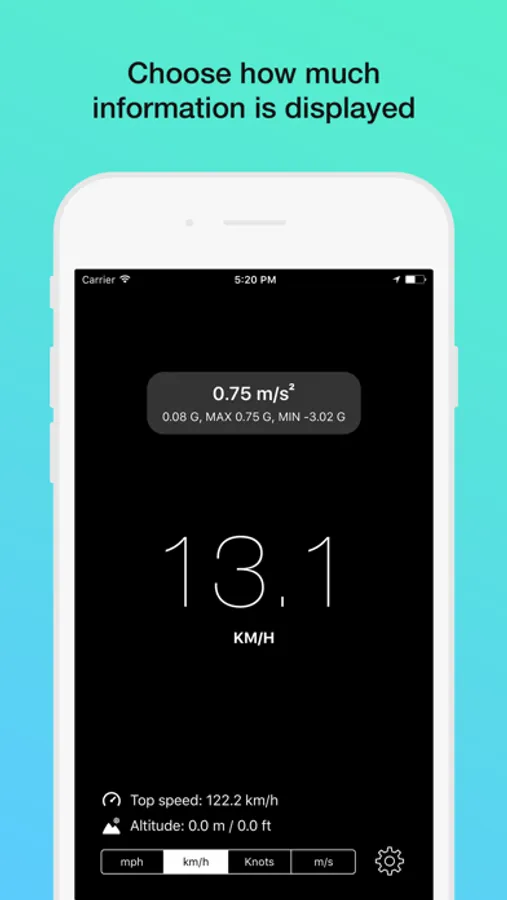 Measure your speed in various units; miles per hour, km per hour, knots and meters per second. It includes a HUD-mode for easily viewing your speed in the car, without having to look down. A top speed mode helps you to keep track of your highest speed.