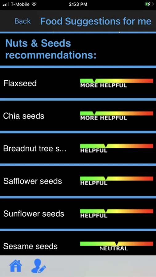 • Is this food good for me? This feature answers the common question if a food of your choice helpful or harmful to your personal situation. And it does so in an easy to understand and colorful graphic form.