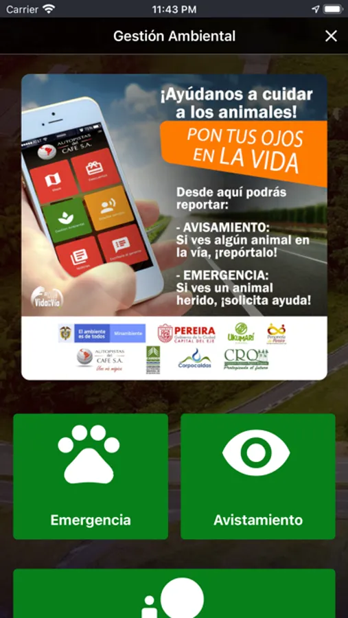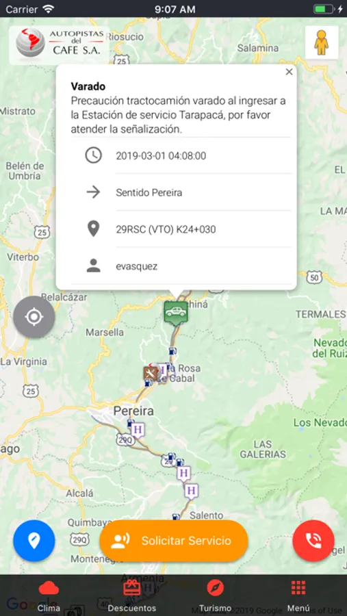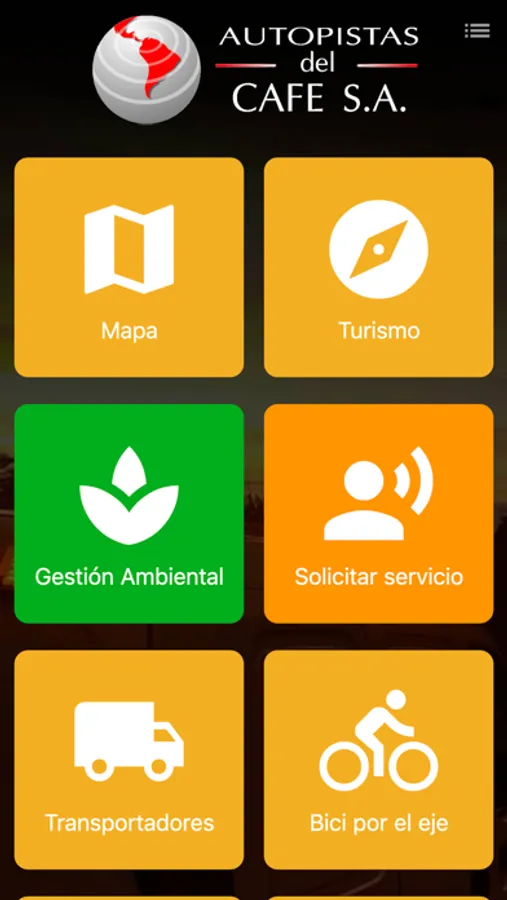 Aplicación de la concesión Autopistas del Café donde el usuario podrá solicitar información y servicios gratuitos en la vía como Grúa, Ambulancia, Inspección y Policía, también les permite consultar en tiempo real los estados de las vías y puntos de interés de la concesión.