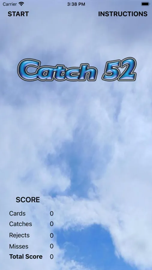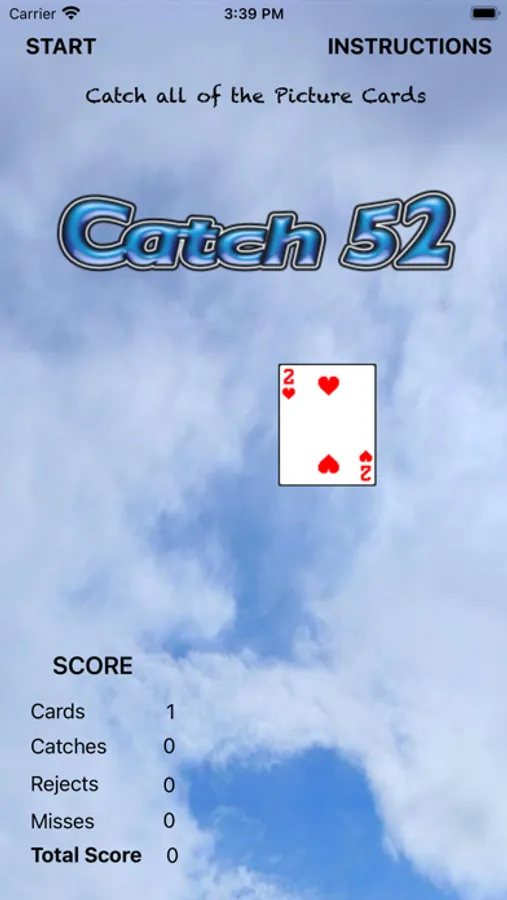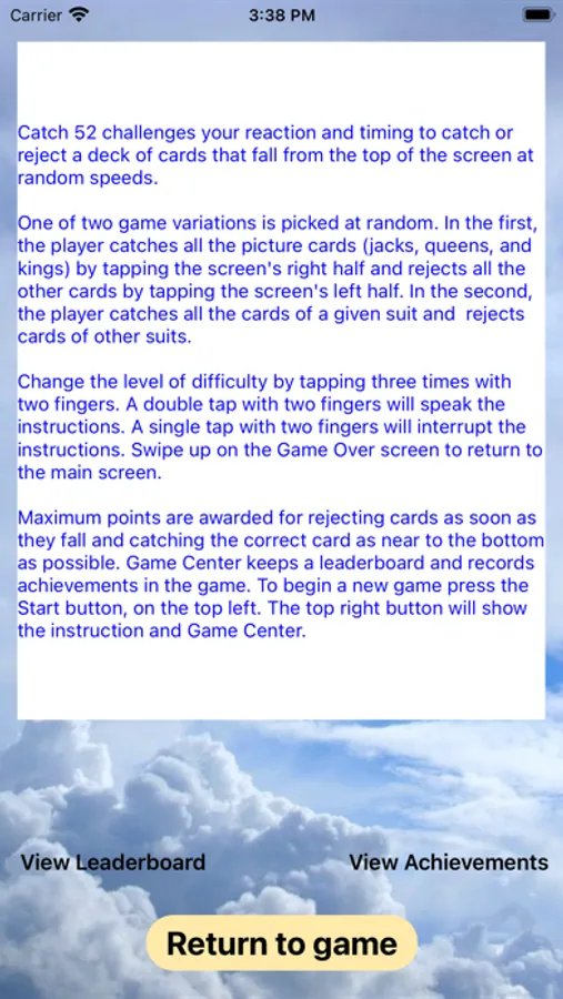Catch 52 is played in portrait orientation and uses gestures to change all of the game settings. One tap with two fingers silences the speech. Two taps with two fingers repeats the verbal instructions. Three taps with two fingers changes the difficulty or speed of gameplay. There are two screens, a game screen and a game over screen which is shown after three misses or completing a full deck of cards. On the game over screen a single tap with one finger on the right or left side of the screen will show the game center standings. Use a swipe up to return to the game screen.