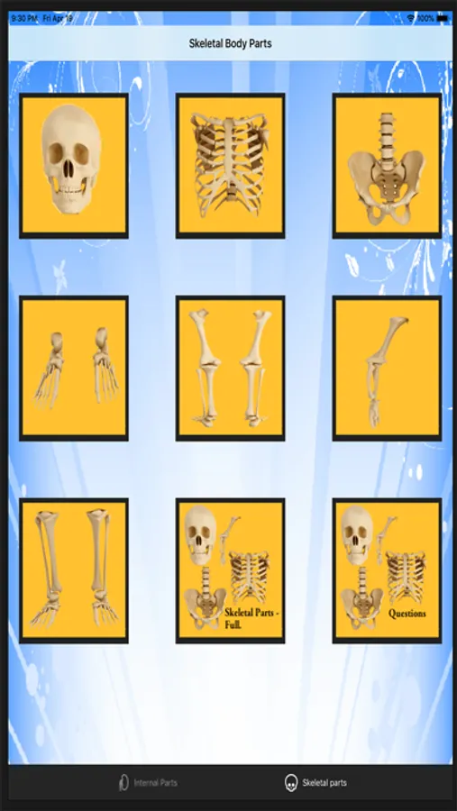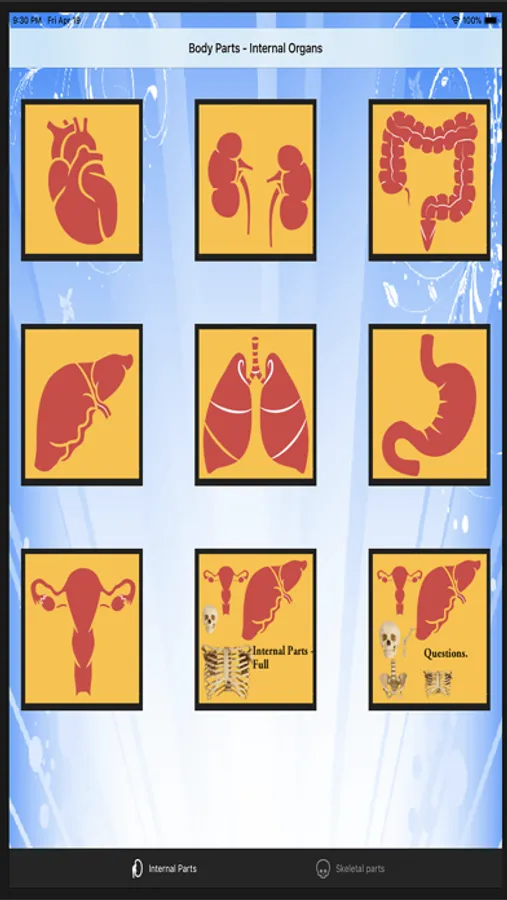 "Body Parts - Internal" shows and describes the internal organs and the skeletal parts in a human body. This application is a reference tool and aids in quickly learning the basic internal organs ( brain, heart, liver, lung etc.) and their functions. This app also shows the main bones with a short description of the skeletal parts. Questions at the end of the app, helps audience to revise the contents.