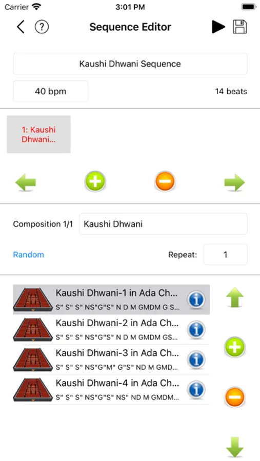 With TaalMala Composer, you can compose your own Taals, Lehras/Nagmas, SwarMandal patterns by simply typing the notation of the Taal/Lehra on special built-in Taal/Lehra keyboard. With TaalMala Sequencer, you can arrange sequences of fixed or randomized or tempo-based Taal and Lehra/Nagma patterns.