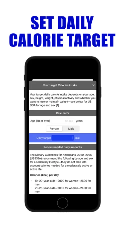 It's easy to consume too many calories, and high consumption is linked to obesity and overweight, which in turn are linked to high blood pressure, heart attacks, strokes, chronic kidney disease, cancer, arthritis, and swelling of the feet and legs. This app can help you lower your intake or maintain a healthy intake to avoid obesity and overweight. Set your daily target calorie intake based on the information provided on RDAs, which vary for age, sex and activity and your healthy weight goals. You can change this target at any time.