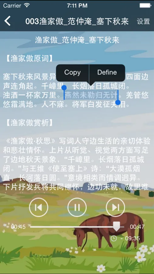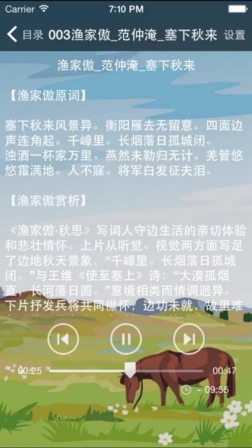 孩子学习诗词,常常由于难以理解诗人的创作风格和创作动机,以及对诗词中的典故和意境难以确切的把握,从而降低了他们学习古典诗词的兴趣,本应用精编宋词三百首全集,每首宋词含有原文、赏析与解释,寓教于乐,有助于提高孩子学习古典文化的兴趣,是送给青少年的一部不可多得的学习娱乐佳作!是陶冶情操,丰富学识,提高涵养的不二之选~