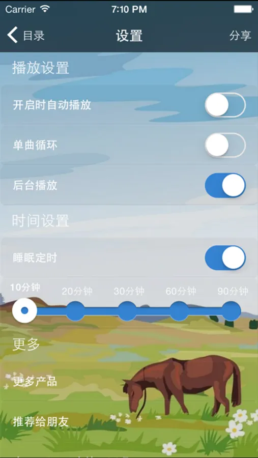 4.睡眠定时:设定自动关闭播放时间,时长从5分钟到3小时,到时自动关闭播放。