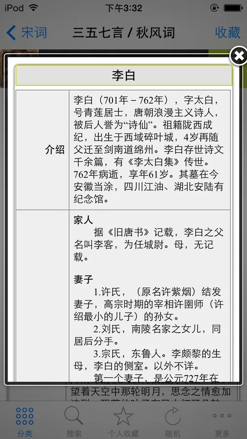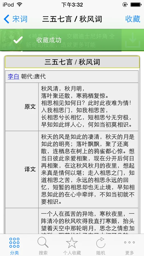 本应用根据宋词内容特点, 从细节处入手, 精心编制, 提供美文收藏、快速检索搜索、随机查看等等诸多实用功能, 同时每首宋词均提供翻译、赏析、作者详细介绍等丰富内容, 绝对会成为您鉴赏宋词的最佳APP!