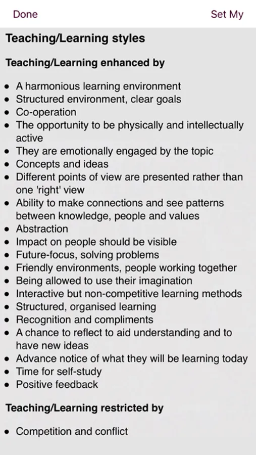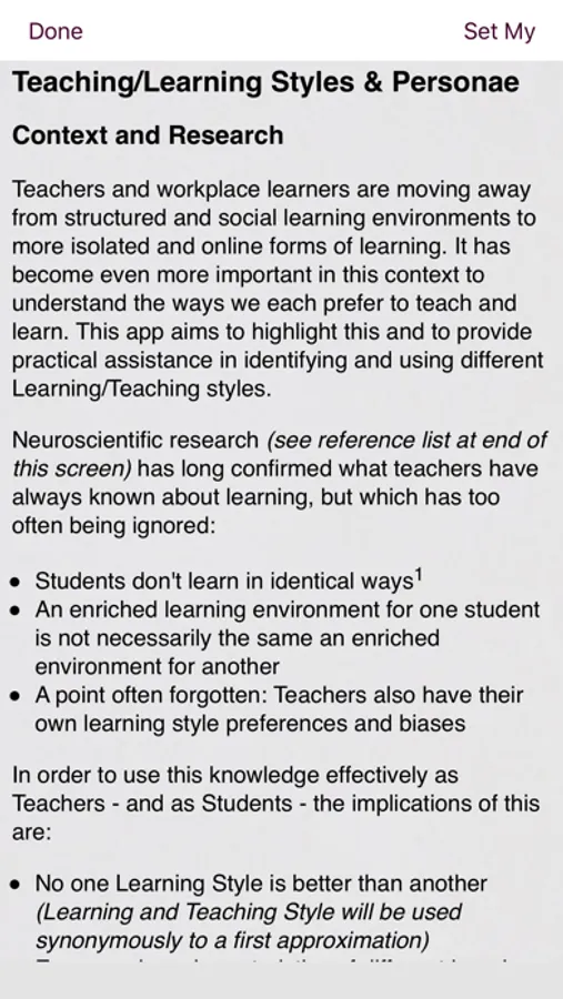 Teachers and workplace learners do not now solely use classroom, social and structured learning environments but also more online, remote and self-focused forms of learning. It has become even more important in this context to understand the ways we each prefer to teach and learn. This app aims to highlight this and to provide practical assistance in identifying and using different Learning/Teaching styles.