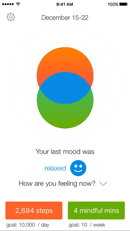 Track progress towards how 'centered' you are as you get closer to meeting your goals. Also, see how adding meditation sessions and adding more steps to your day affects your mood. Over time, as you meet your goals, your activity and mindfulness circles will come together into one, representing your centered being.