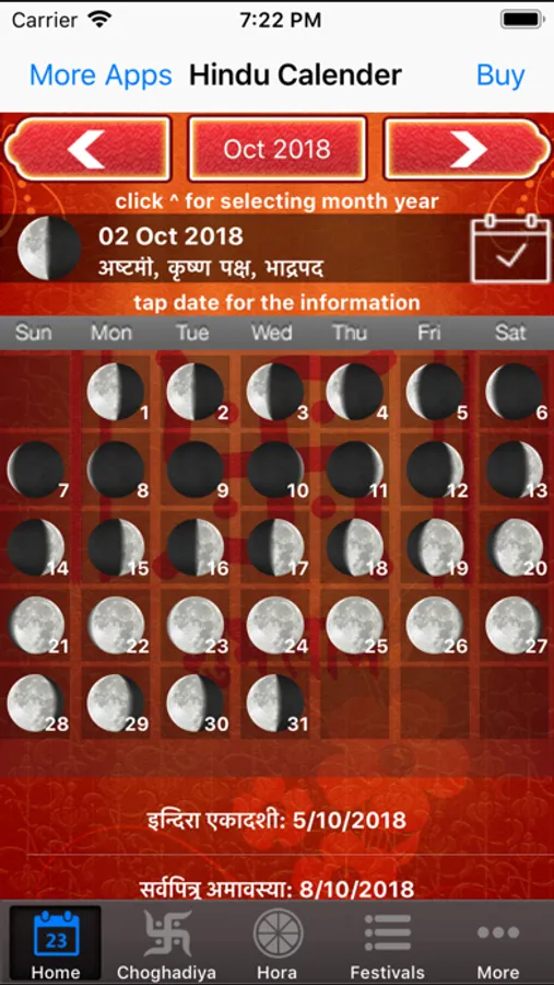 Hindu calendar showing the tithi, paksha, and the important hindu festivals.