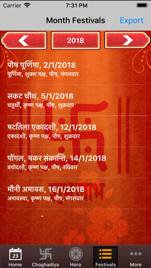 Displays the list of festivals in Hindi for the currently selected month. User Also Export Festival List in Excel and PDF Format.