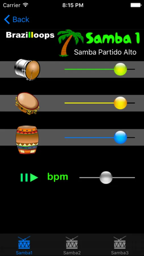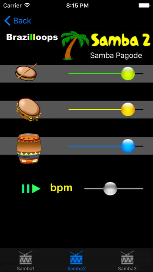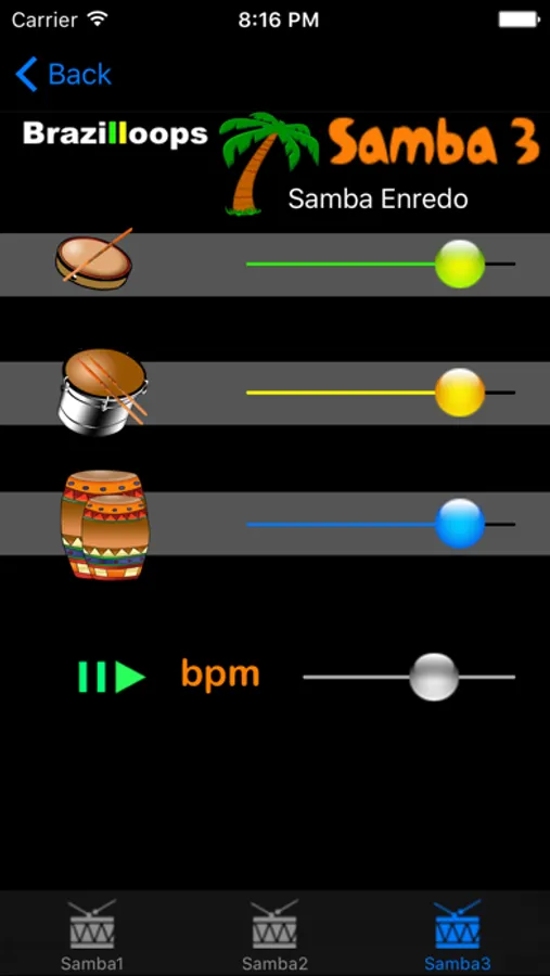 Get this genuine samba feeling with 4 different samba styles, 3 of them with 3 independent bundled instrument tracks each with mute and volume control functions.