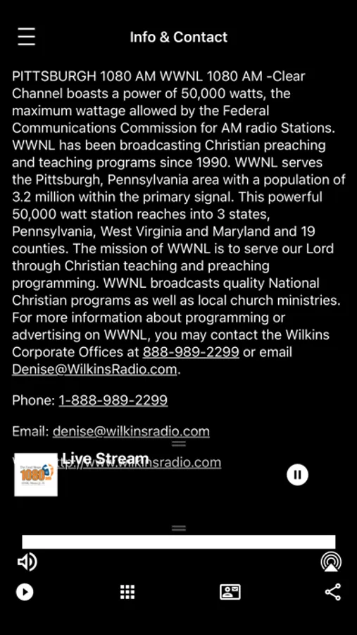 WWNL 1080 AM -Clear Channel boasts a power of 50,000 watts, the maximum wattage allowed by the Federal Communications Commission for AM radio Stations. WWNL has been broadcasting Christian preaching and teaching programs since 1990.