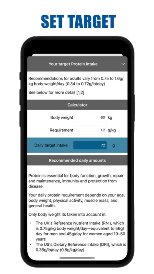 Choose and set your target daily protein intake using the information provided in the app based on current guidelines. This can be changed at any time.