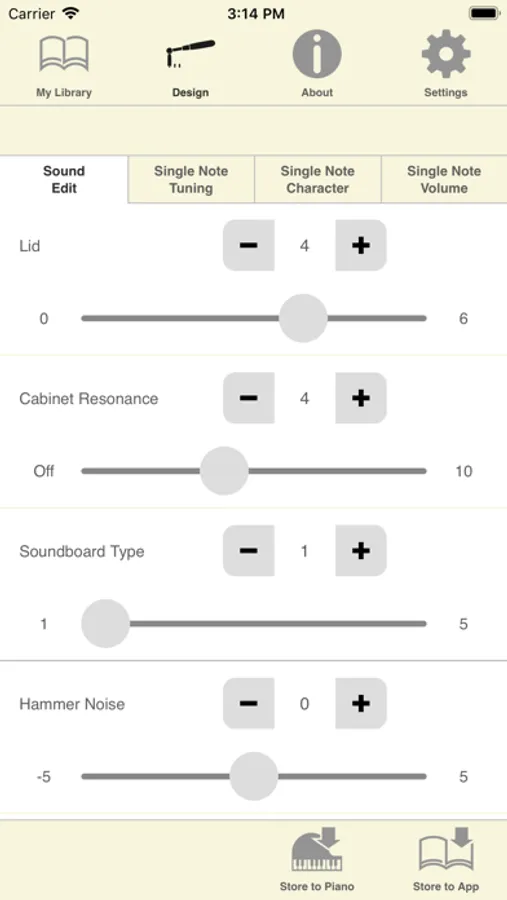 - Parameters related to lid position, strings, and hammers are listed at a glance, and can be edited and transferred to the piano easily.