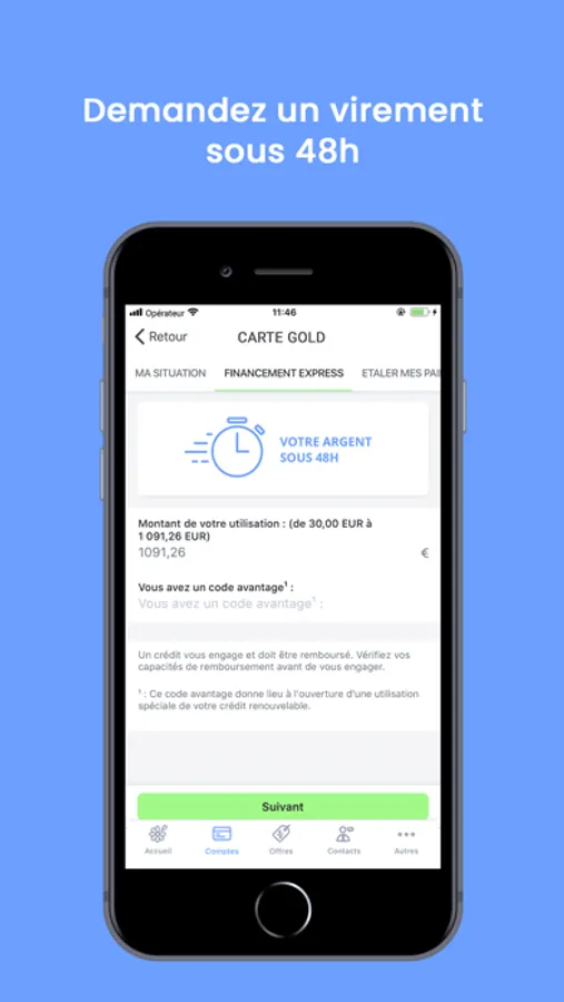 Quand on a besoin d’argent c’est tout de suite => Demandez un Financement Express (utilisation spéciale de votre credit renouvelable) 24h/24 et 7j/7.Choisissez la somme dont vous avez besoin et recevez votre argent sous 48h sans justificatif de projet supplémentaire.