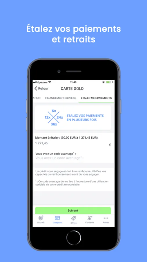 Pourquoi décaler son plaisir quand on peut décaler son paiement => Étalez le montant de vos paiements et retraits en 6, 12, 24 ou 36 fois pour donner de la souplesse à votre budget si vous êtes détenteur d’une carte Gold, d’une carte bancaire Casino ou d’une carte bancaire Cdiscount (utilisation spéciale de votre crédit