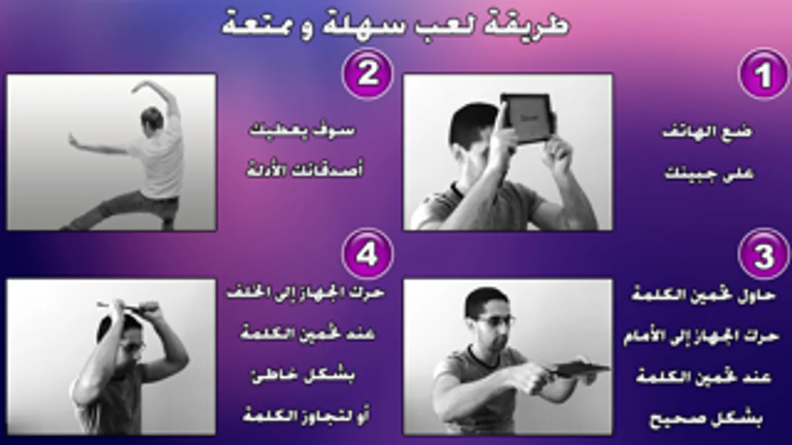 حاول تخمين الكلمة. حرك الجهاز إلى الأمام عند تخمين الكلمة بشكل صحيح!