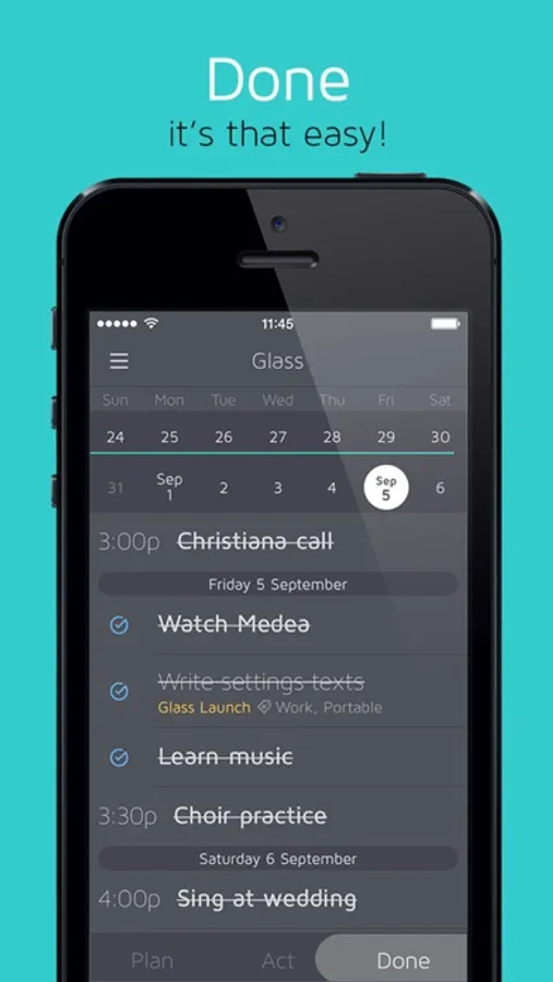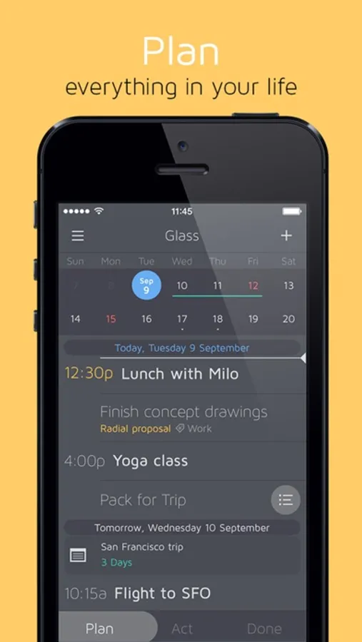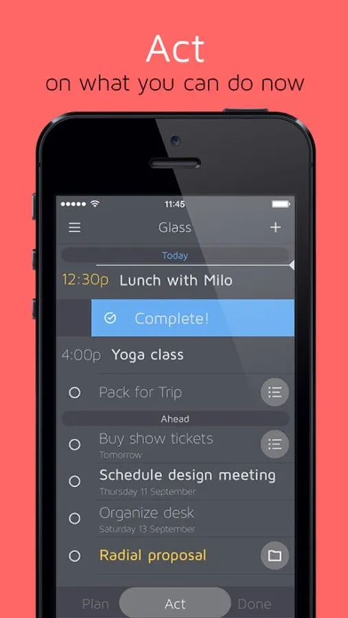 In Glass, you manage your tasks right in your calendar, where you can schedule them into your day. And when it’s time to get things done, Glass shines. Just touch the ACT switch, and Glass transforms your calendar into a streamlined action list. You see only today’s appointments, and only those upcoming tasks you can act on now, all sorted by priority. All other distractions are eliminated. It's an automatic, intelligent life planner that lets you think months ahead or sharpen your focus to the next few hours.