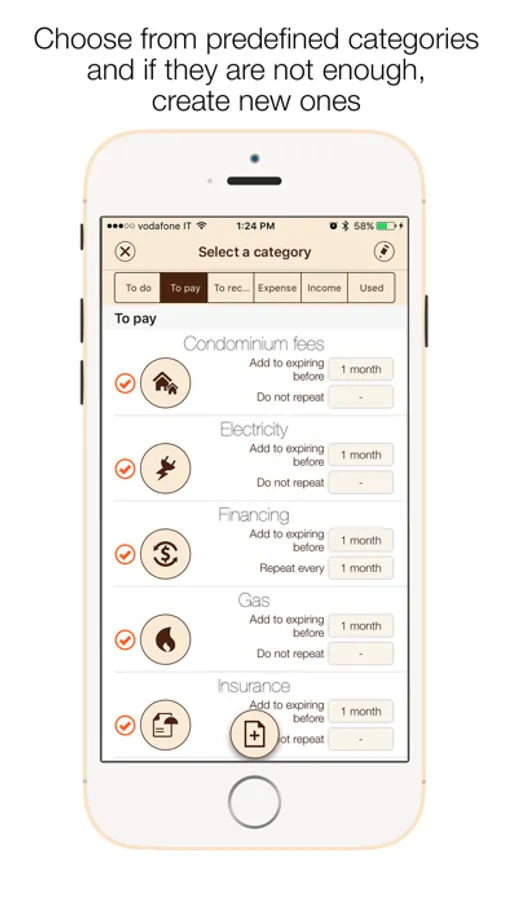 Payable (bills, deadlines, rent, mortgage, etc.): Unpleasant reminders but they certainly need to be remembered: enter the category, the amount and the due date