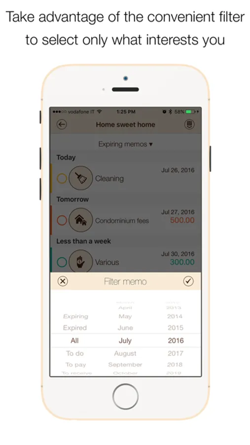 To do (maintenance, repairs, housework, etc.): With this type of memos you can put everything you 'need to do' setting a date, category and additional description