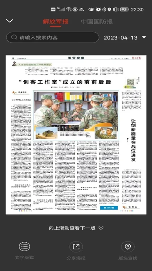 解放军报客户端运用文字、动静态图片、音视频、H5、直播等多种播报形式,传递中国军队声音,展示中国军人形象,解读环球军事资讯,聚焦官兵的切身利益,回应涉军热点问题,让用户享受到信息网络时代融媒体军事新闻播报的独特魅力。