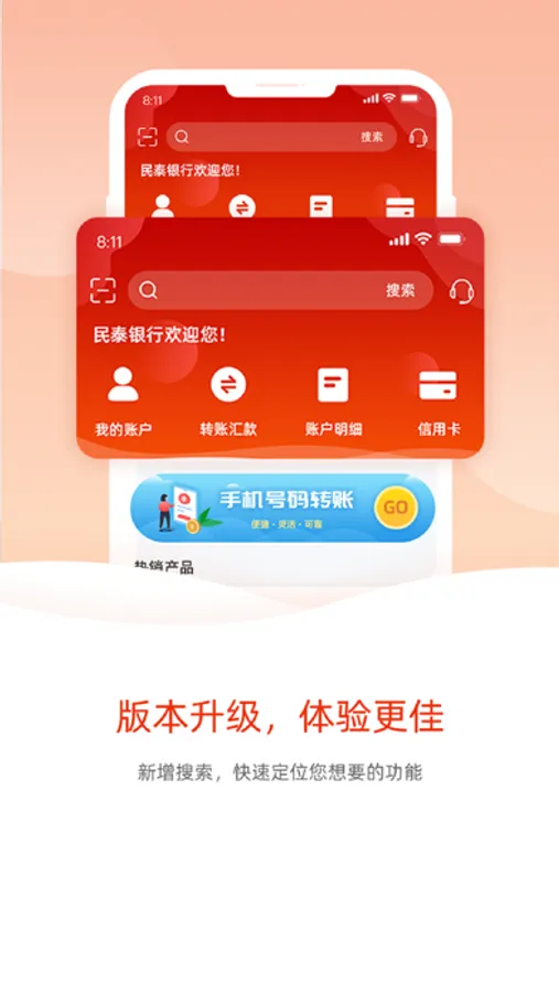 民泰银行手机银行界面简单友好,为您提供账户查询、转账汇款、理财服务、信用卡管理、个人循环贷款等各项金融服务。操作简便,可轻松上手。