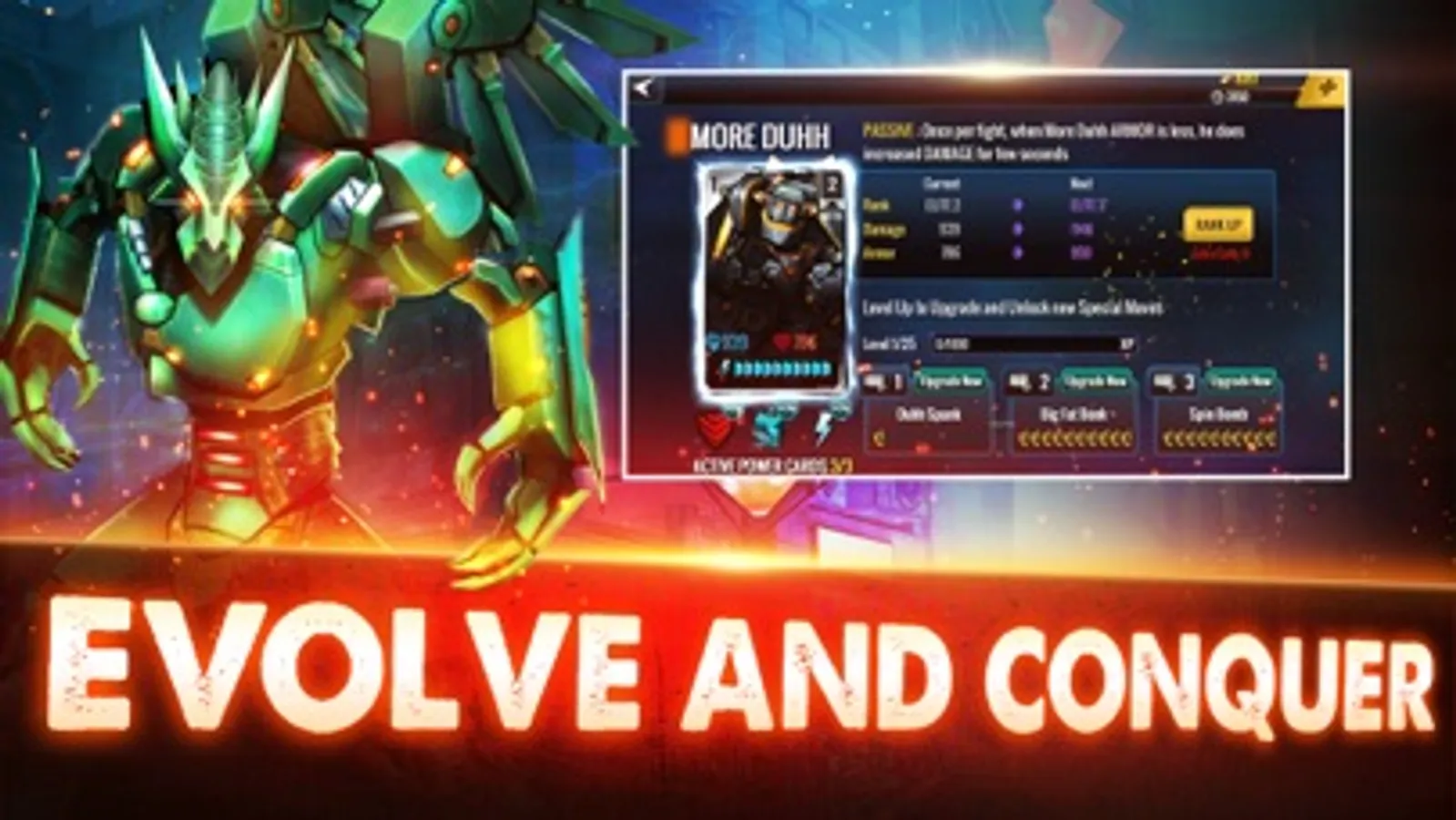 • Load up with power cards and overclocks to boost up your robots! Increase damage and armor, upgrade characters and specials and let loose the true might of steel!