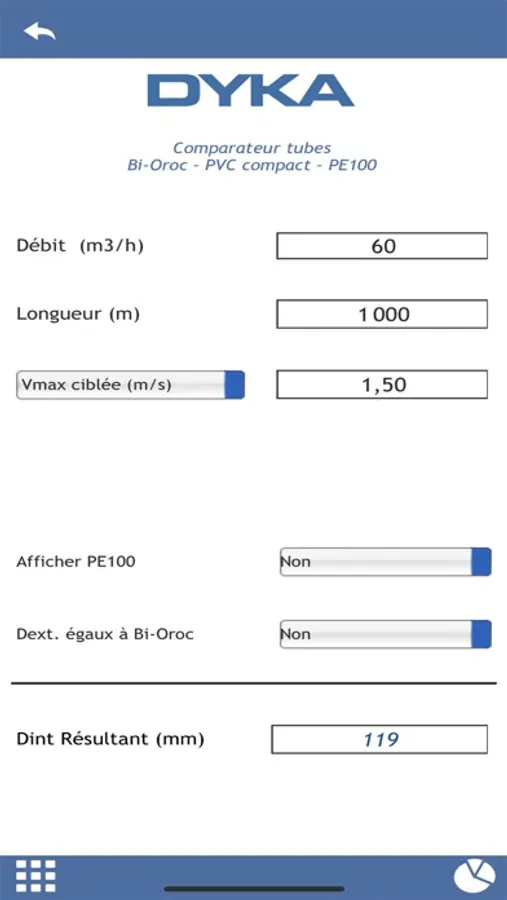 The application computes the ideal diameter for the chosen type of pipe (Bi-oroc, PVC-U, PE100) as a function of the flow rate, the length of the network and the maximal speed or head loss tolerated.