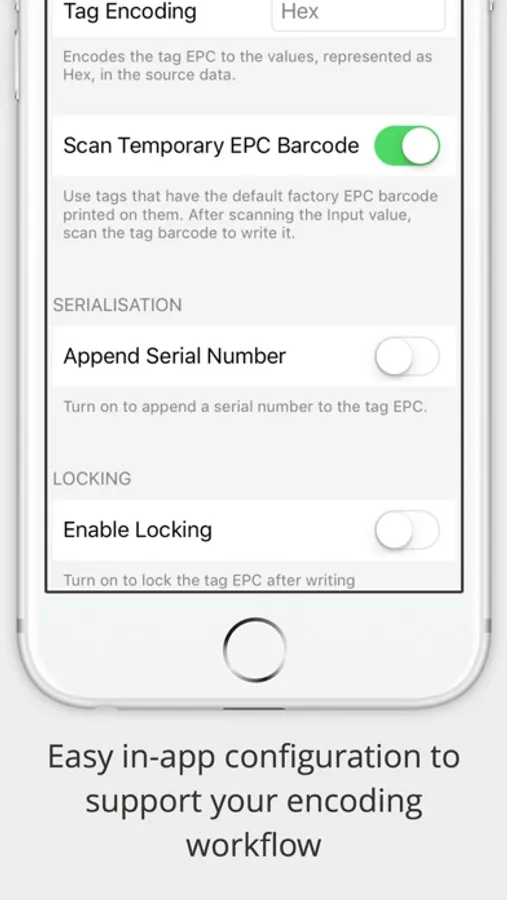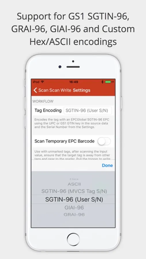 RFID Scan Scan Write is designed to rapidly commission UHF RFID tags with both industry standard and custom EPCs. The App can take GS1 barcode information and then encode tags with GS1 SGTIN-96, GRAI-96 or GIAI-96 compliant EPCs or use scanned Hex/ASCII data directly to generate custom EPC values. Tags can also be locked and passwords specified so that they are secured against un-authorised modification.