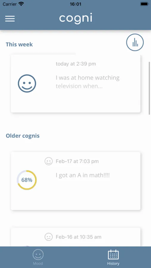 Cogni is the easiest, quickest and fun way for you to write down your thought records. These records are widely used in Cognitive-Behavioral Therapy (CBT), but they can be useful even for non-therapists.