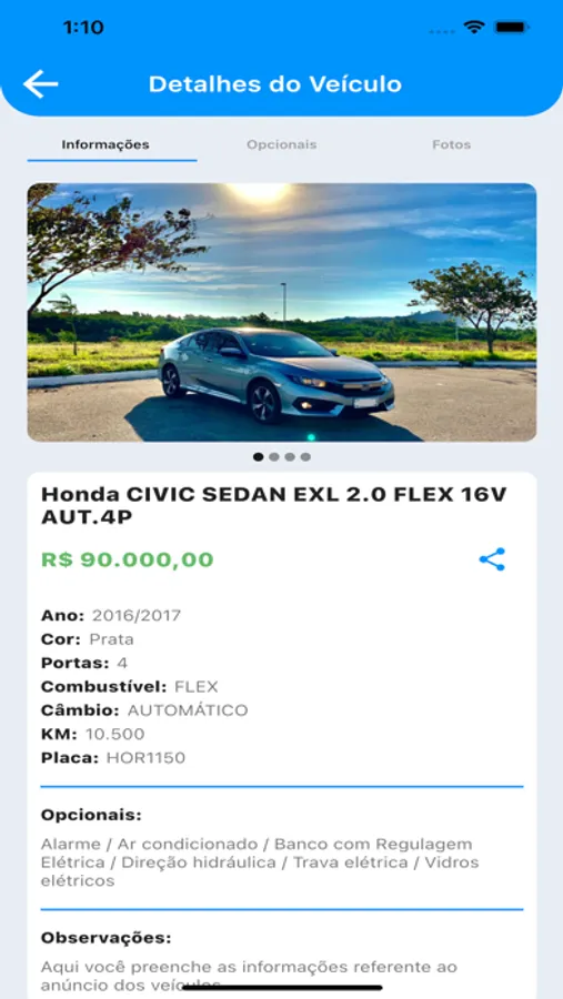 - Nos Detalhes do veículo é possível ver uma listagem de todas as fotos, os detalhes do veículo, observações e opcionais.