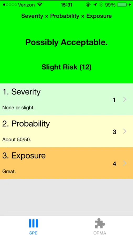 The SPE model calculates risk for specific hazards, such as launching or recovering small watercraft or clearing a hiking trail of fallen trees, by determining risk as a function of severity, probability, and exposure. Risk = Severity x Probability x Exposure. You can evaluate its potential impact your activity by the calculated risk score, the degree of risk determined, and the recommended guidance.