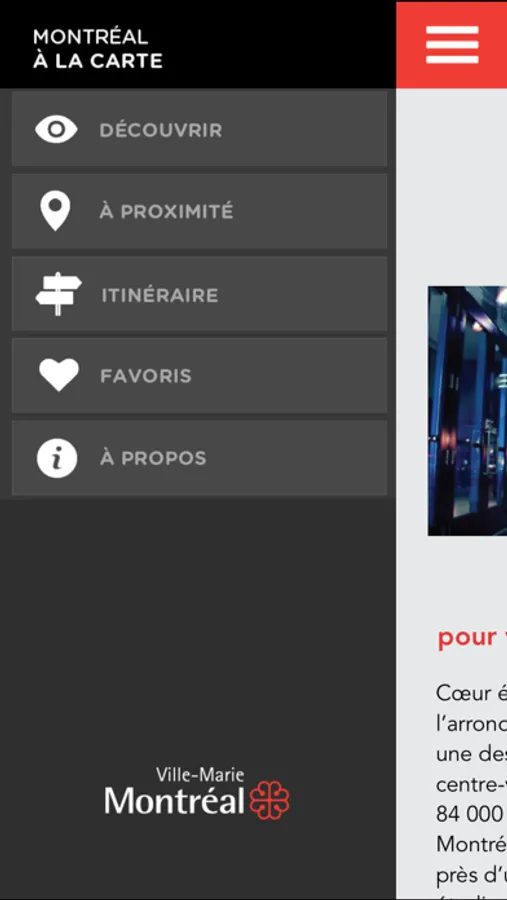 Avec l’application Montréal à la carte, le centre-ville de Montréal n’aura plus de secret pour personne! Visiteurs et résidants pourront planifier leurs sorties au cœur de la métropole, découvrir ses trésors, obtenir les coordonnées des points d’intérêt ainsi que rechercher et localiser facilement les ressources et services à proximité. L’application comprend un répertoire des lieux d’hébergement, lieux culturels, parcs et espaces verts, artères et centres commerciaux, stationnements, stations de métro, installations municipales et plus encore!