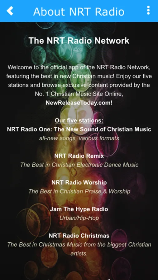 Choose from NRT Radio One (new music in all formats), NRT Radio Worship (praise & worship), NRT Radio Remix (Christian EDM), Jam the Hype (Christian Hip Hop/Urban), NRT Radio Christmas and our newest stations, NRT Radio Positive (Christian & Mainstream) and Radio GC (Country & Southern Gospel).