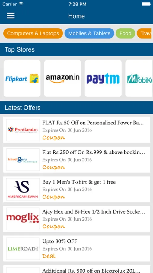◦ Get coupons and deals by store. For e.g.. Flipkart, Jabong, Myntra etc..