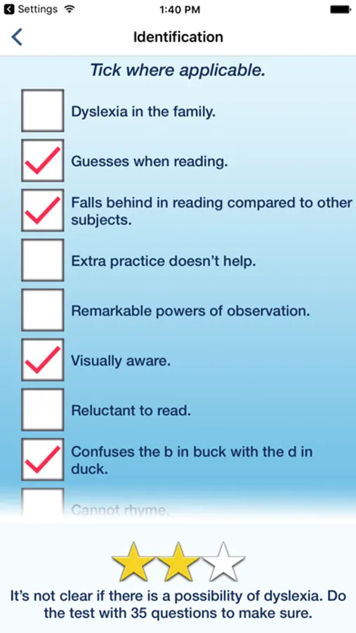 The purpose of the app is to quickly get an idea if someone is showing any signs of dyslexia. The earlier dyslexia is recognised, the sooner a treatment plan can be implemented. But be aware, this is an indication and not a diagnosis.