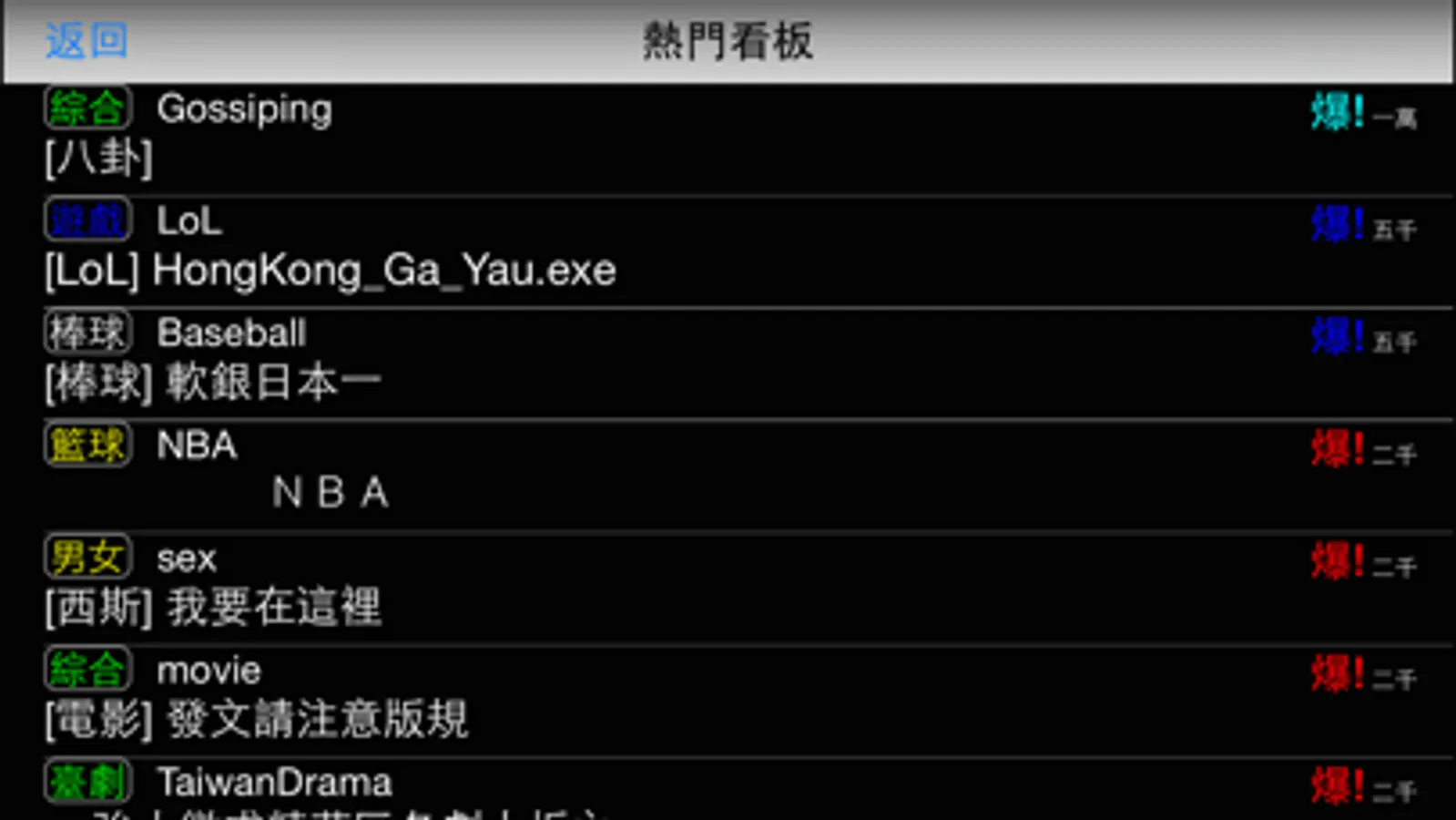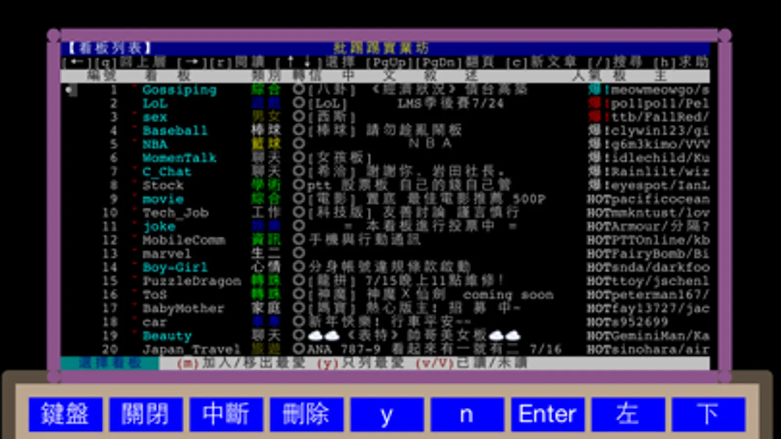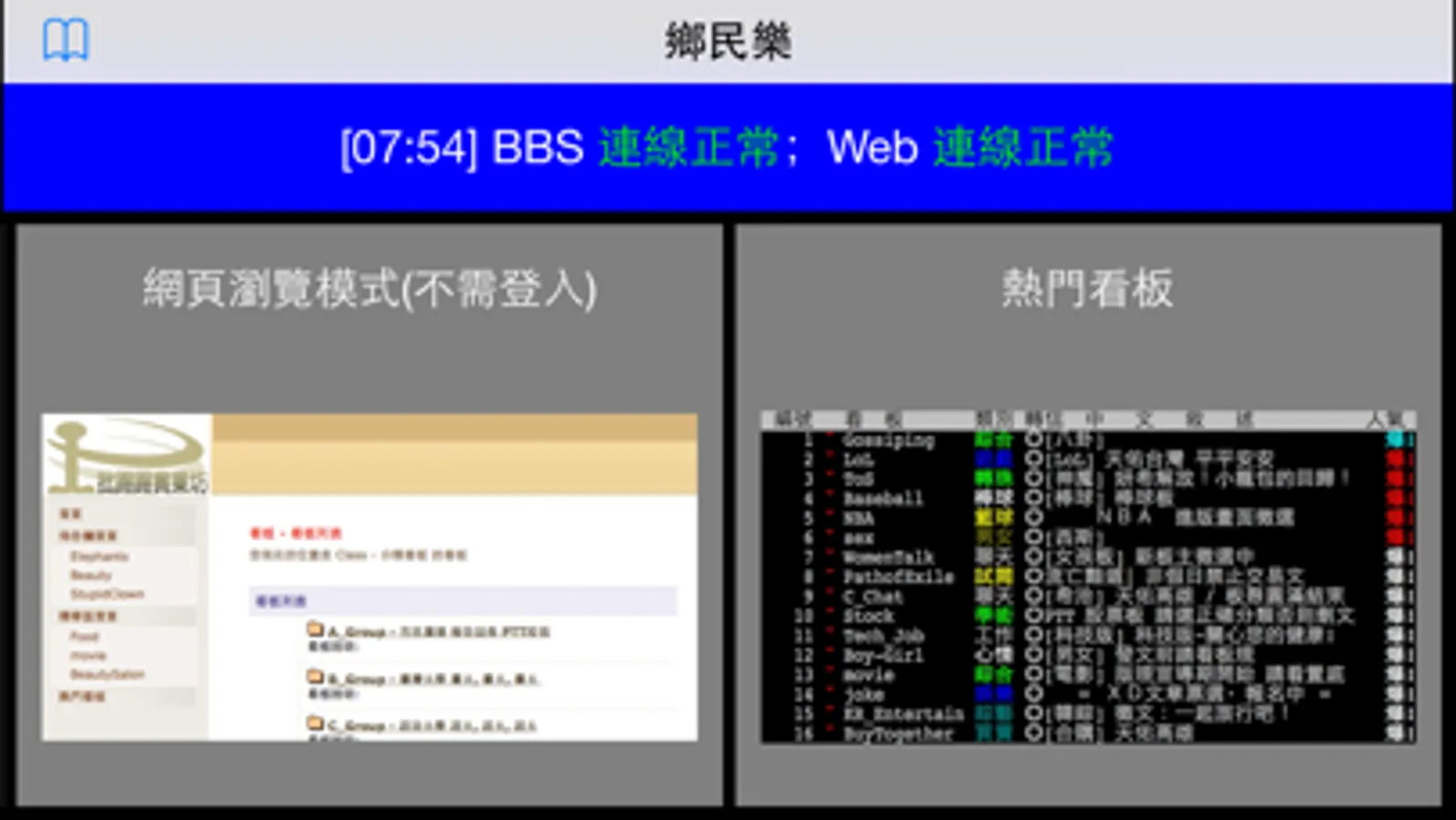 - 復古版 Telnet 瀏覽方式可發文、回文並支援註冊帳號等完整的BBS操作介面。瀏覽時可點擊畫面,透過觸控可進行文章內容及列表換頁、快速移動等