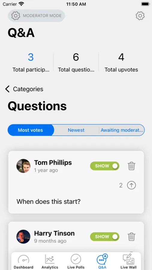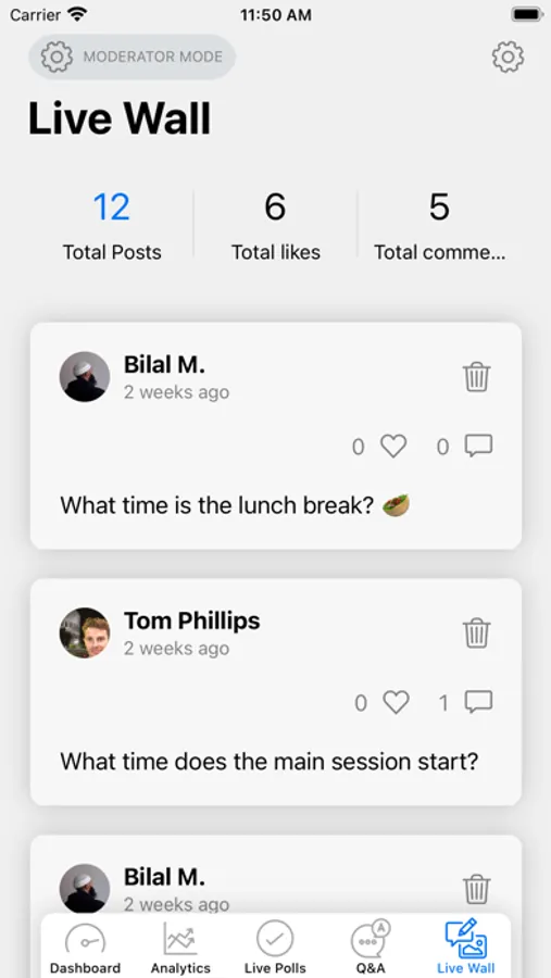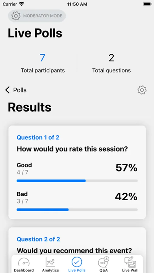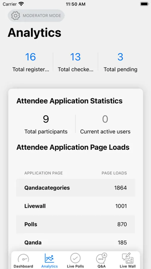 View live analytic and monitor interaction, including live polls, live wall, Q&A, attendee app and virtual.