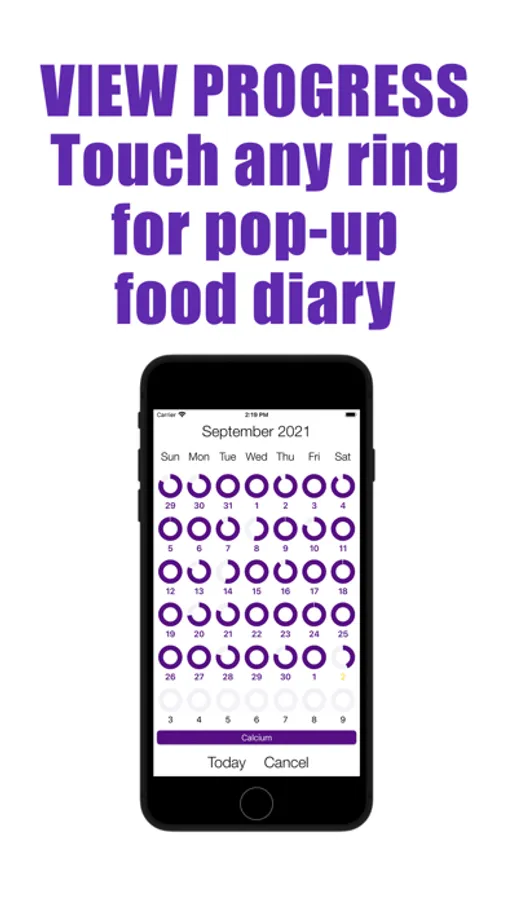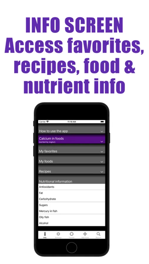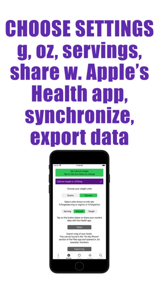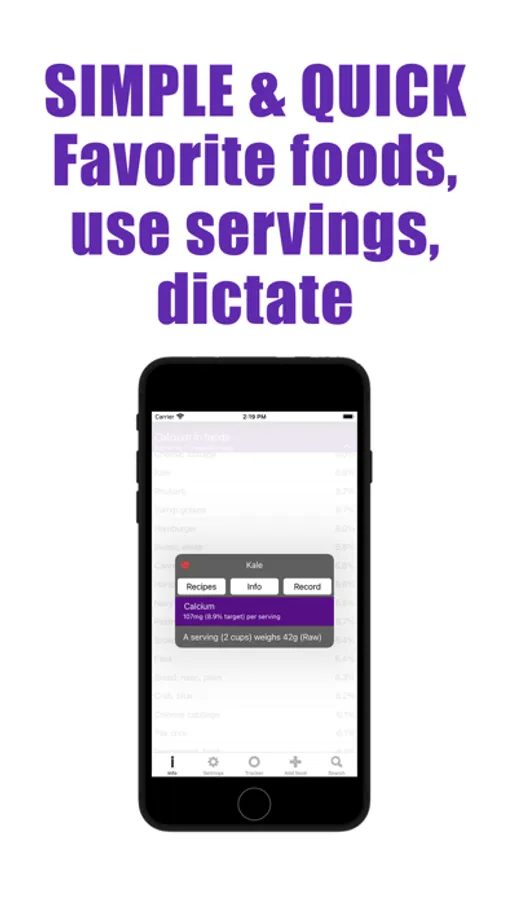 Record the foods & drinks and amounts you consume using the barcode scanner (if in the US or Canada where calcium content is required on the Nutrition Facts label), dictation, by favoriting foods, or using Search and using the serving sizes provided (see App Preview 2). The serving sizes are mainly those suggested by USDA Food Data Central, but can be changed at any time. Your progress towards your target daily intake will be shown on the dashboard in real-time.