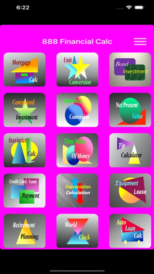 Users may re-arrange the placement of calc icons in the app main's view, by long pressing on an icon and dragging it to a new location. Furthermore, users may customize the main view's background with various colors or images, and all calc views' background color via the app's Settings menu.