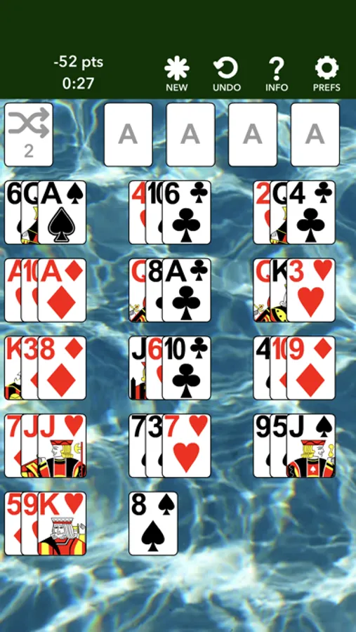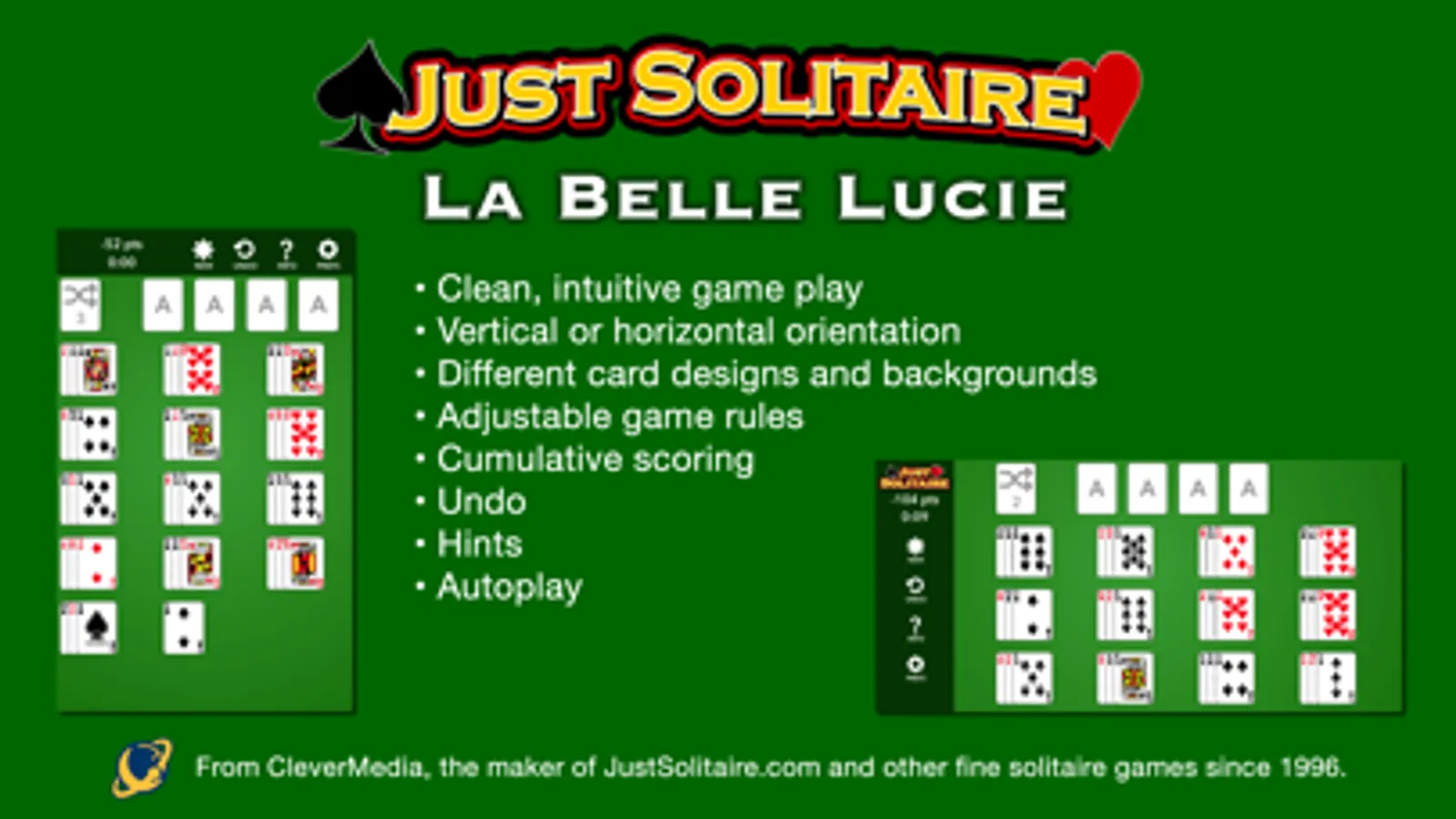 Ready for a solitaire challenge of a different sort? Try La Belle Lucie solitaire, an interesting and heavily skill-based solitaire game. Move cards around my tapping or dragging them. You can change the number of tableau shuffles to make the game harder or easier. You can choose between different backgrounds and card designs. Works in both vertical and horizontal mode.