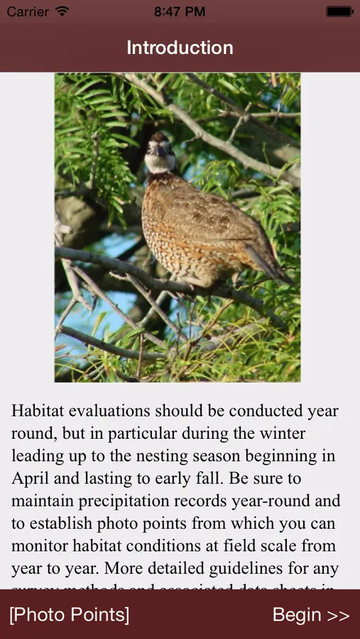 Habitat loss is a major factor in northern bobwhite declines over the last few decades. Although the plant species included are specific to central and west Texas, The Northern Bobwhite Habitat Evaluation app offers valuable habitat evaluation techniques for other regions as well. This tool allows the user to quickly and easily assess the habitat condition on the user’s property by posing a series of questions to be answered while in the field. The app calculates a habitat quality score based on the user’s input and provides recommendations for improving habitat beneficial for northern bobwhite.