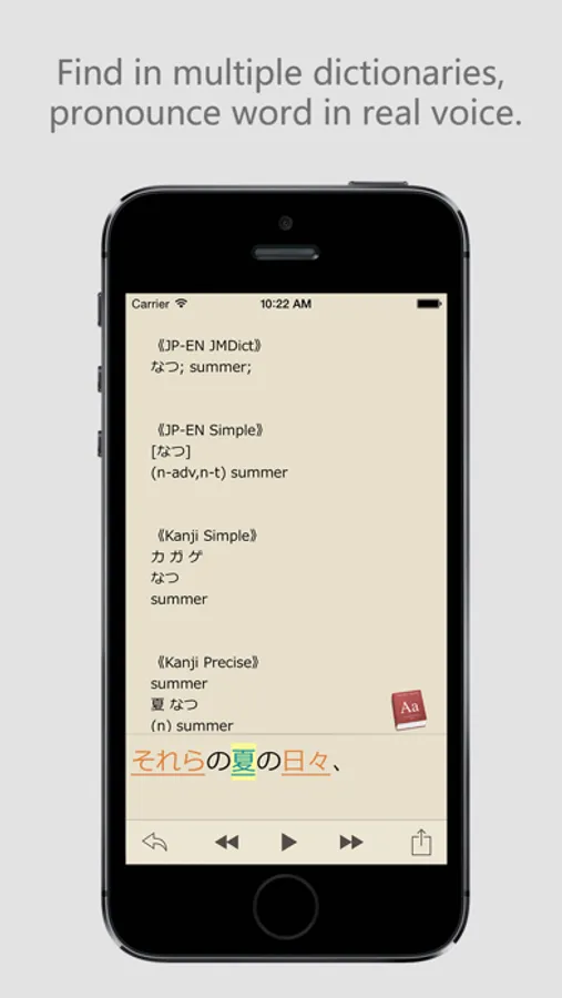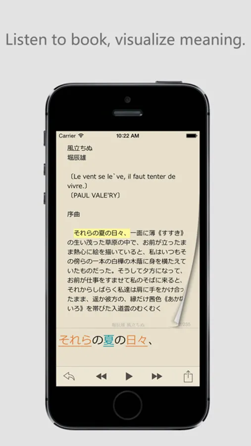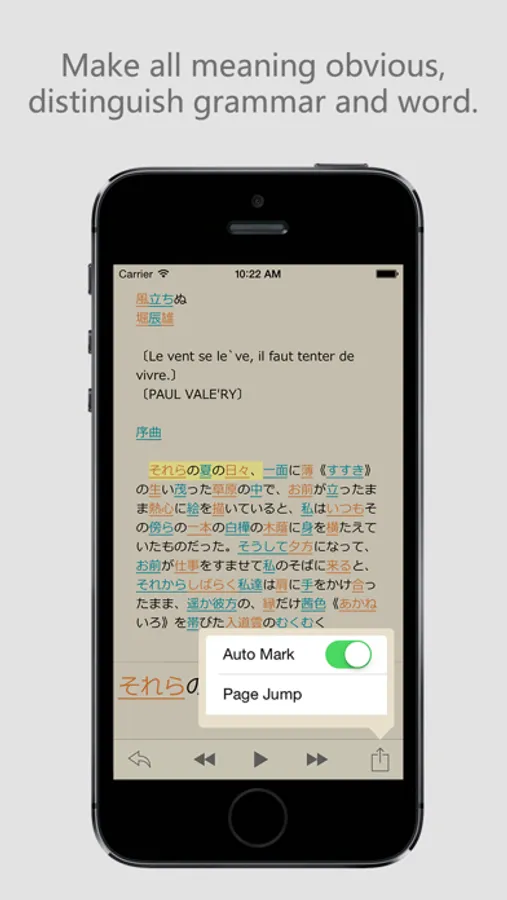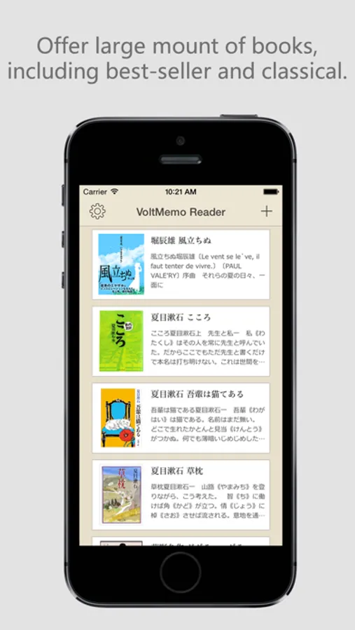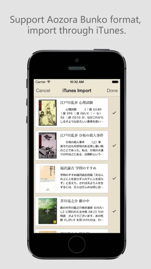 5. Book importation: You can import favorite book through iTunes. We support Aozora Bunko format too.