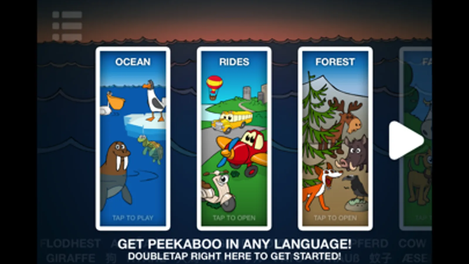 Sweet animals that your child will adore. Let your child have fun while learning animal names and sounds. This easy-to-use app was designed for your toddler to play and learn at the same time. The game contains both visual, verbal, and auditory cues and can be setup as recreation from toddlers, as cue cards to learn animal names in English, Spanish, German, Danish, Mandarin, Cantonese, and Japanese , or with the written names displayed as a cue before the animal is revealed to nurture intrinsic visual reading skills in toddlers.