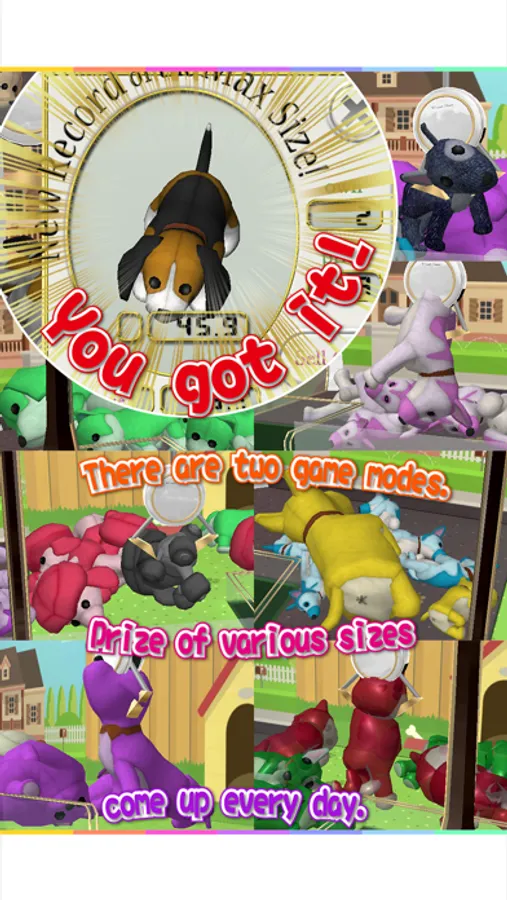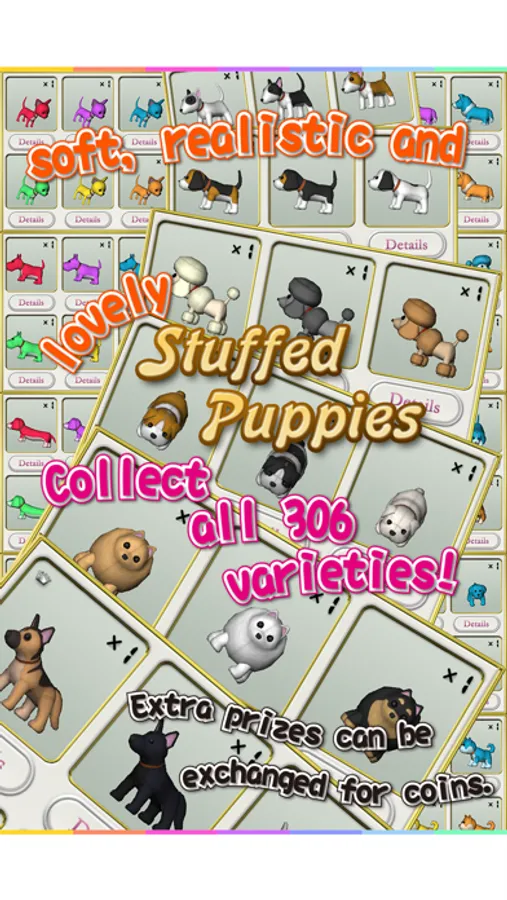 The prizes are various kinds of cute stuffed puppies that are very soft and limp. Realistic soft feel makes you feel being healed.