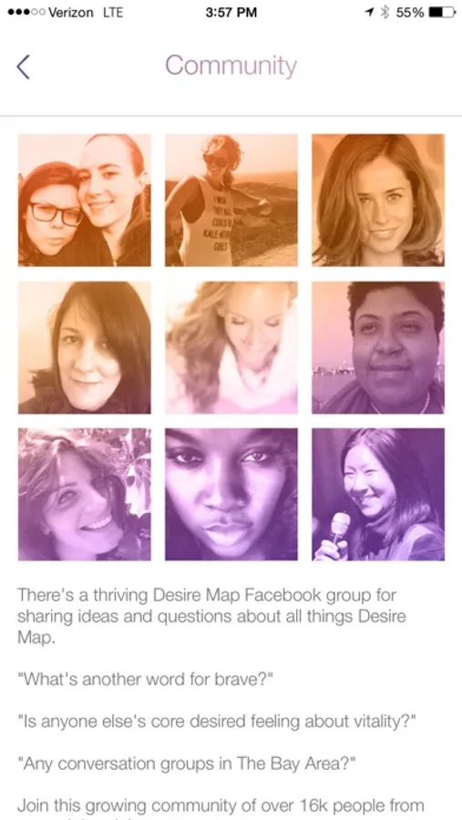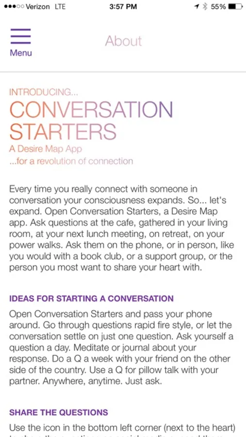 Also included with the app is a collection of Desire Map audio clips - over 3 hours of sonic love, all for you. So, right now: Open the Conversation Starters App. Speak your truth. Listen more closely than you ever have. Discover your Core Desired Feelings (we call them CDFs for short) and do the most important thing of all: feel the way you want to feel.