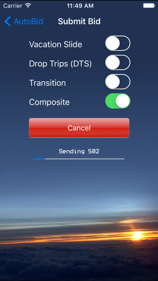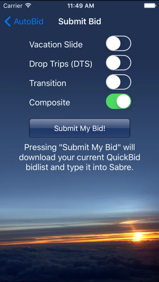 AutoBid for iOS takes your bid list from QuickBid and enters it into Sabre for you! No longer do you have to cart around your laptop on your 4 day trip just to enter your bids! Set up AutoBid on your phone or iPad, press "Submit My Bid" and relax as it's done for you.